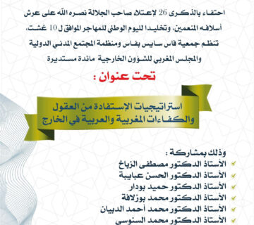 26 يوليوز 2025 : تنظيم مائدة مستديرة حول موضوع ” استراتيجيات الاستفادة من العقول والكفاءات المغربية والعربية في الخارج”نظّمت جمعية فاس سايس، ومنظمة المجتمع المدني الدولية لقيم المواطنة والتنمية ... إقرأ المزيد